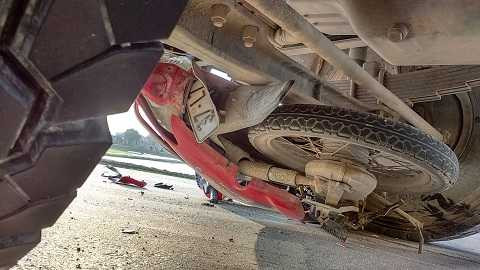 Hậu quả làm xe máy bị cuốn vào gầm, nát bét, người điều khiển xe máy phải nhập viện cấp cứu trong tình trạng nguy kịch.