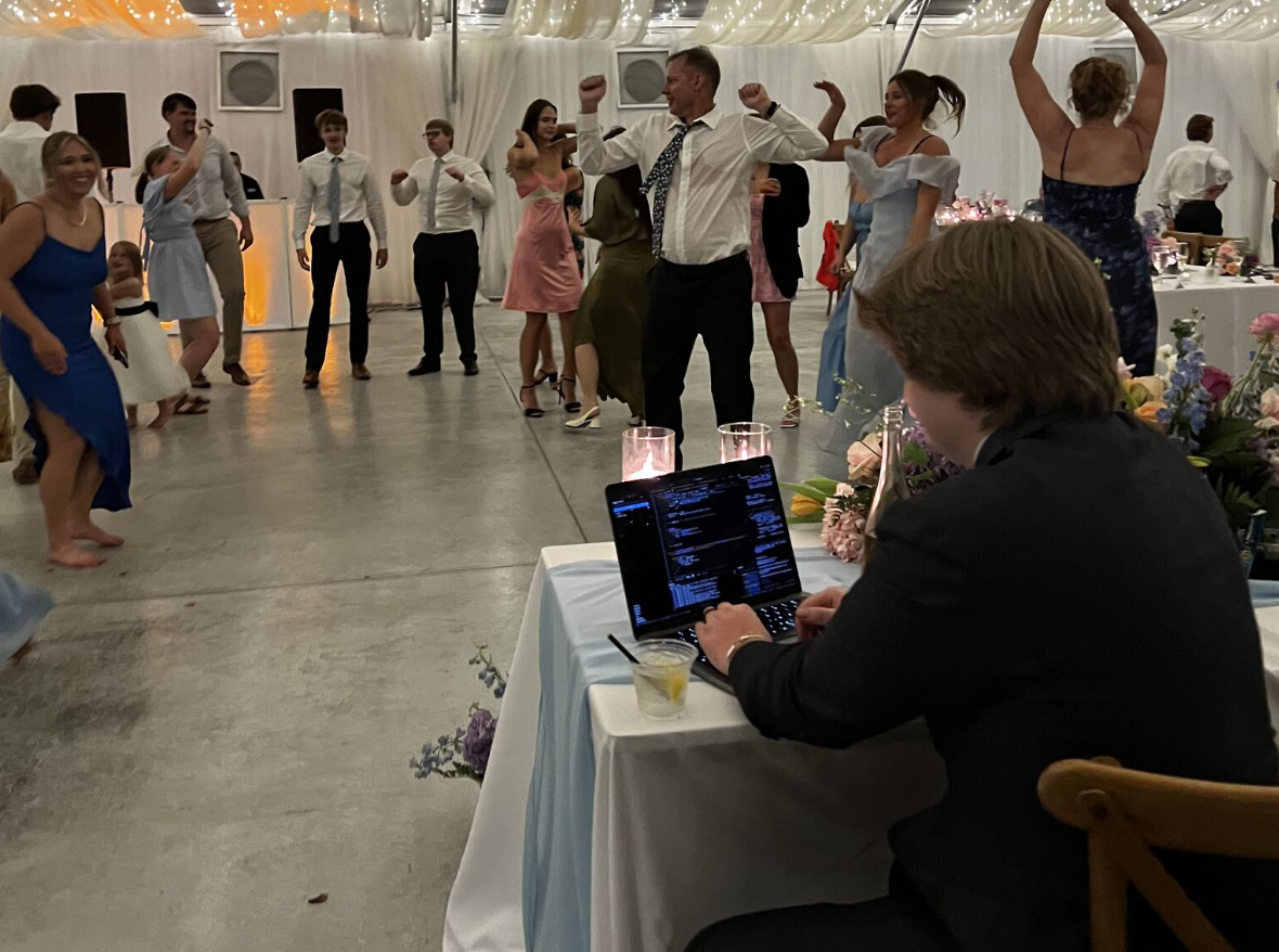 Lý do Casey phải ôm laptop ngay cả trong đám cưới của chính mình, là vì một khách hàng cần khởi động dự án trong vòng 2 tuần - cũng là thời điểm đám cưới của anh diễn ra. Trong ảnh, Casey đang hoàn thành một pull request (đề xuất thay đổi mã nguồn). Đáng chú ý, ngoài chú rể ra, khách mời vẫn đang vui chơi, nhảy múa.