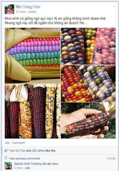 Nina chia sẻ, cô ngày nào cũng nhận được lời nhờ mua giống từ Mỹ, thắc mắc về hình dáng thực so với trên trang web bán hàng. Tất cả các trái bắp trong hình (trên mạng) đều chung một tên gọi. Tuy nhiên, khi trồng bắp sẽ có trái như hình 1, hoặc 2, hoặc 3 như trên web giới thiệu, nhưng không phải bắp nào cũng có hình đẹp như những viên bi.