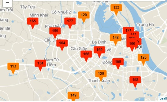 Tại điểm đo Chi cục Bảo vệ môi trường, chỉ số AQI ở mức 156, mức màu đỏ (ảnh hưởng tới sức khỏe con người). Tương tự, nhiều điểm ở mức màu đỏ như Tây Mỗ (AQI 159), Thanh Trì (AQI 169), Hoàn Kiếm ( AQI 166), Thành Công (AQI 169), Mỹ Đình (AQI 164), Hàng Đậu (AQI 181), Phạm Văn Đồng (AQI 177)...