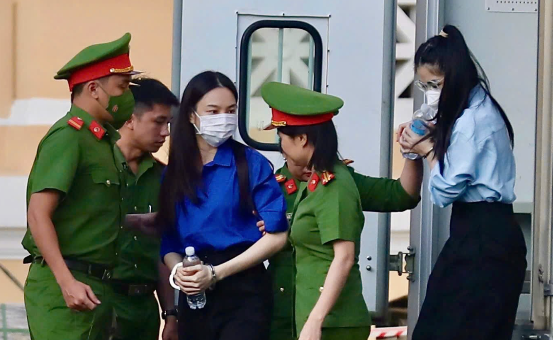 Bị cáo Nguyễn Thúc Thùy Tiên (áo xanh) và bị cáo Nguyền Thị Thái Hằng - Hằng Du Mục (áo trắng) được áp giải tới phiên tòa. (Ảnh: Hoàng Thọ)