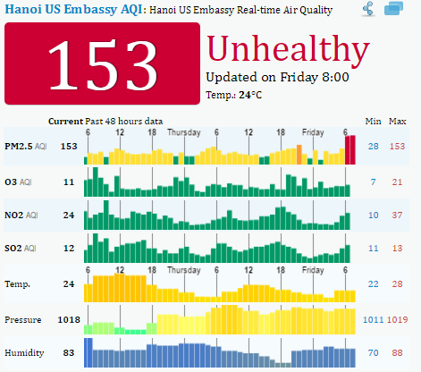 Từ 6h ngày 26/5, không khí khu vực nội thành Hà Nội liên tục ở ngưỡng báo động đỏ khi chỉ số AQI đạt mức 153 - là trạng thái không khí bắt đầu có tác động tiêu cực tới sức khỏe của tất cả mọi người.