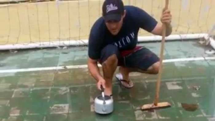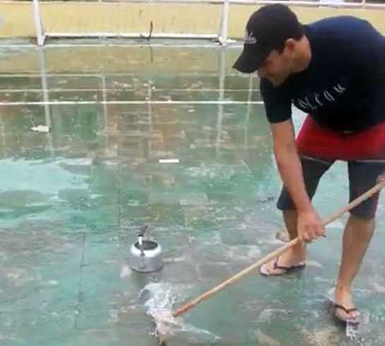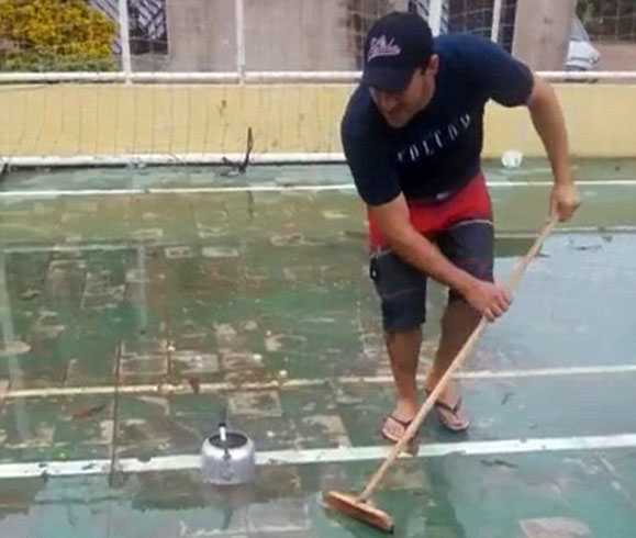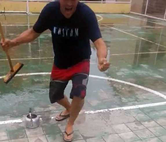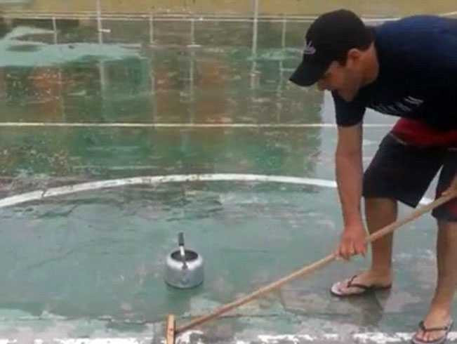 Điều thú vị là thay vì dùng 1 viên đá nặng khoảng 20 kg như trong môn bi đá trên băng, Filho đã sử dụng 1 ấm nước có hình dáng tương tự để thi đấu