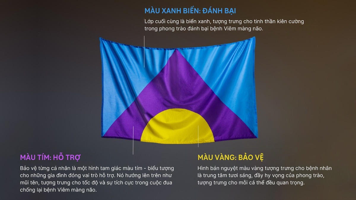 Với ba màu: vàng, tím và xanh lam, Lá cờ đẩy lùi viêm màng não đóng vai trò là một biểu tượng dễ nhận biết nhằm nâng cao nhận thức và hiểu biết về căn bệnh này và mang đến cho cộng đồng một tiếng nói chung giống như cách mà dải băng hồng tạo ra nhận thức về bệnh ung thư vú đã làm được.