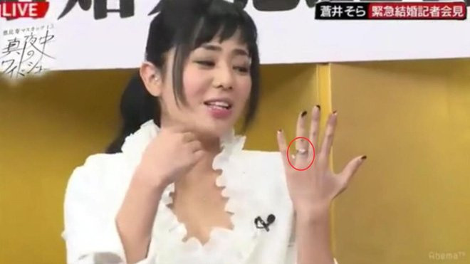 Aoi Sora khoe nhẫn cưới trong buổi họp báo.