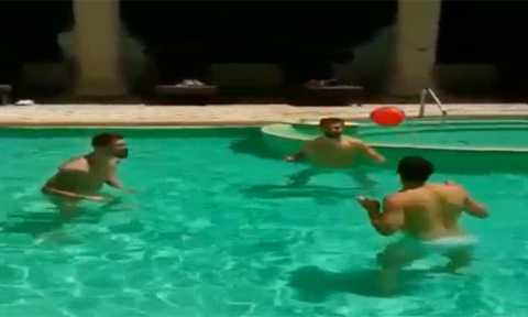 Ramos, Isco và Nacho cùng nhau thư giãn với trò chơi chuyền bóng bằng đầu tại bể bơi trong chuyến du đấu Trung Quốc. Video được Ramos chia sẻ trên trang Instagram cá nhân.