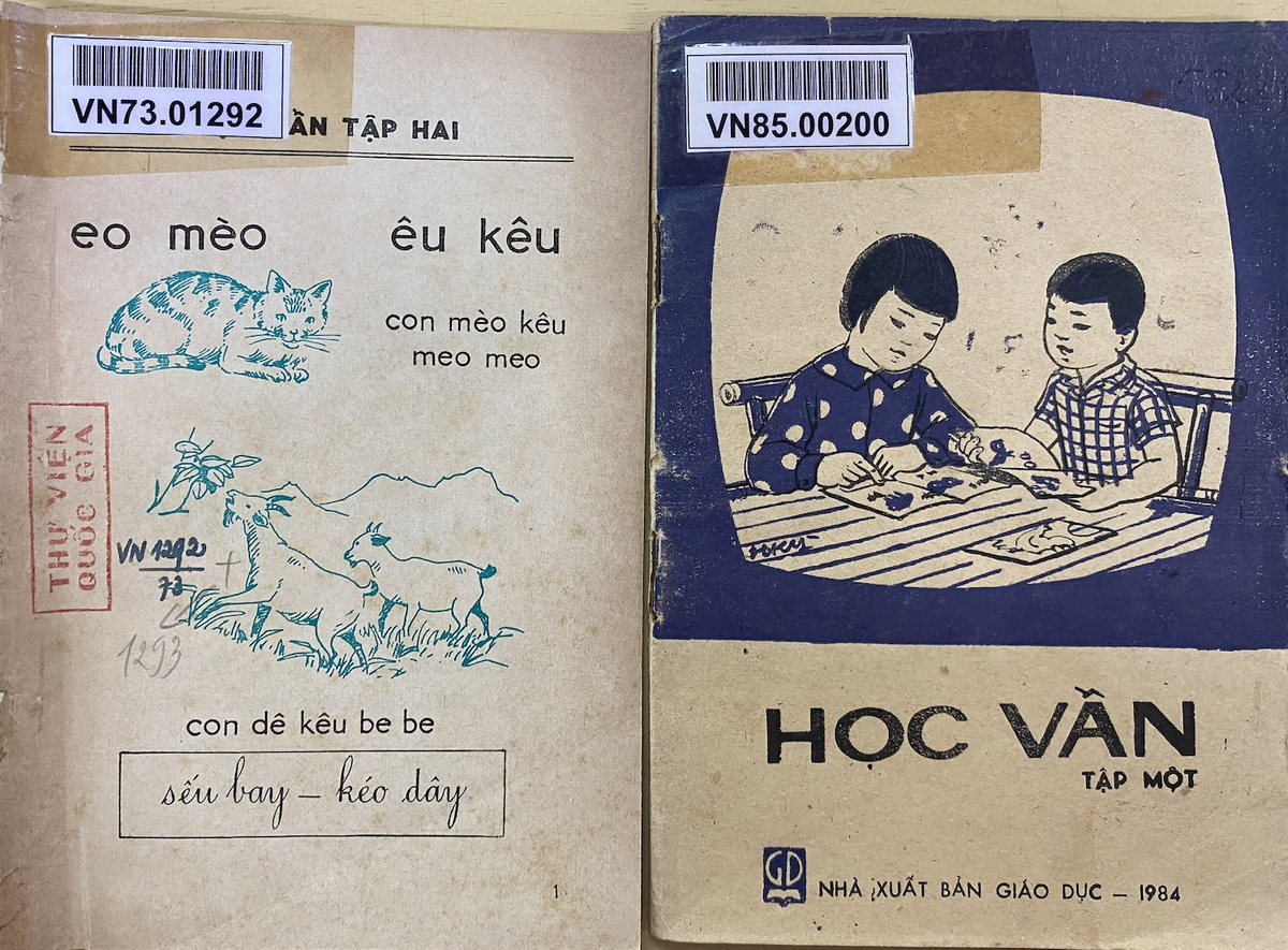 Sách giáo khoa Học vần, xuất bản năm 1984 (phải) và sách Học vần xuất bản năm 1974 (trái). (Ảnh: Hà Cường)