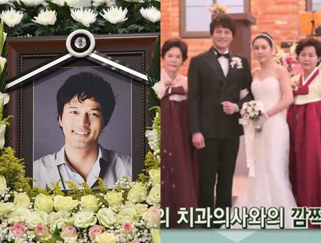 | Nụ cười hiếm hoi của Kim Sung Min trong đám cưới (phải) và người ta lại nhìn thấy nụ cười của anh trong di ảnh ở lễ tưởng niệm. Ảnh: Sina. |