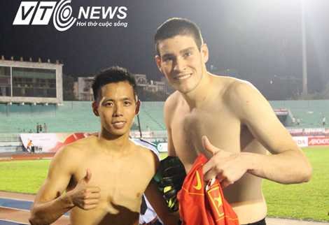 Trận đấu kết thúc được 15 phút nhưng thủ thành Gabriel Gasparotto của đội bóng Brazil vẫn đứng đợi để xin chiếc áo đấu số 10 của tiền vệ Văn Quyết.