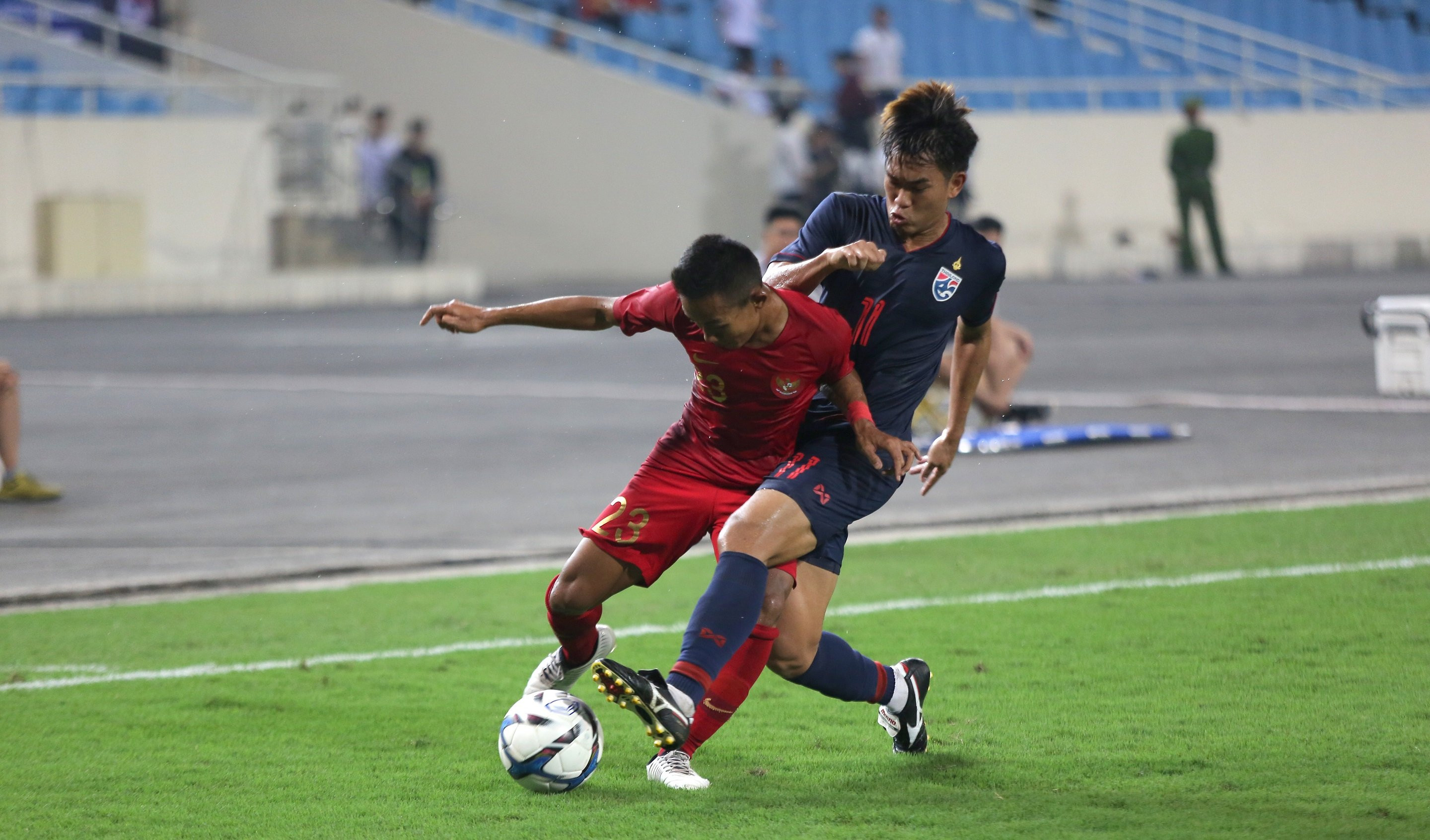 U23 Indonesia (áo đỏ) thua thảm U23 Thái Lan ở lượt trận đầu tiên.