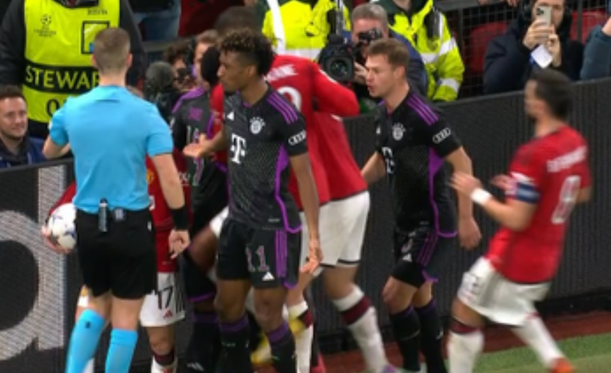 Phút 24, Alejandro Garnacho và Kingsley Coman tranh chấp quyết liệt ở sát đường biên ngang. Động tác kéo vai của Garnacho khiến cầu thủ bên phía Bayern văng xuống đường rãnh bên cạnh mặt sân Old Trafford. Coman tỏ rõ sự khó chịu. Anh bật dậy và lao về phía Garnacho để làm cho ra lẽ.