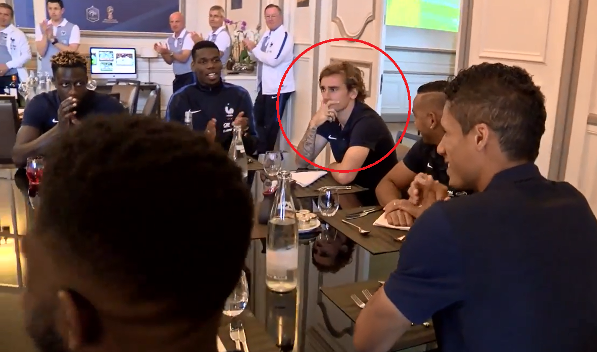 Trong lúc các đồng đội lần lượt tiến đến tay bắt mặt mừng với Varane, Griezmann lại quay mặt lảng ra chỗ khác. Chưa hết, tiền đạo này cũng không hưởng ứng khi HLV Didier Deschamps đề nghị cả đội vỗ tay chúc mừng Varane trước bữa ăn.