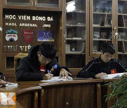 Không chỉ phải học văn hóa, các học viên của Học viện HAGL Arsenal JMG còn phải học thêm ngoại ngữ (tiếng Anh và tiếng Pháp) vào các buổi tối thứ 2-4-6 hoặc thứ 3-5-7 hàng tuần. Trong lần ghé thăm Hàm Rồng mới đây, chúng tôi may mắn được chứng kiến những Công Phượng, Văn Toàn, Tuấn Anh…đang chăm chỉ “đèn sách” trong lớp tiếng Anh của cô giáo Minh Phượng.