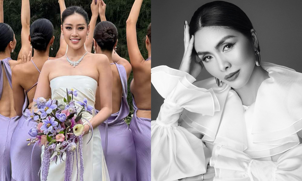 Hoa hậu Khánh Vân lần đầu hé lộ bức ảnh cưới với dàn phù dâu giấu mặt. Cô diện váy cúp ngực, chất liệu lụa được thiết kế đơn giản. Phía sau Khánh Vân là dàn phù dâu mặc váy lụa tím, để lưng trần gợi cảm.