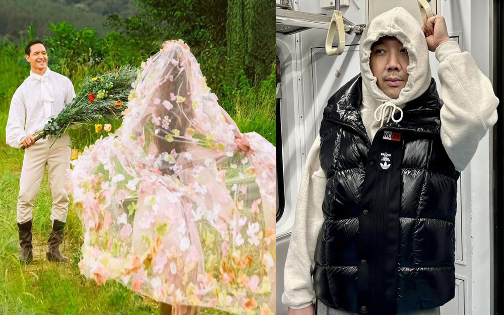 Trấn Thành dí dỏm đăng 2 bức ảnh so sánh khi chụp cho vợ và được vợ chụp lại trên tàu điện ngầm. "Có điên được chưa?", anh hỏi fan.