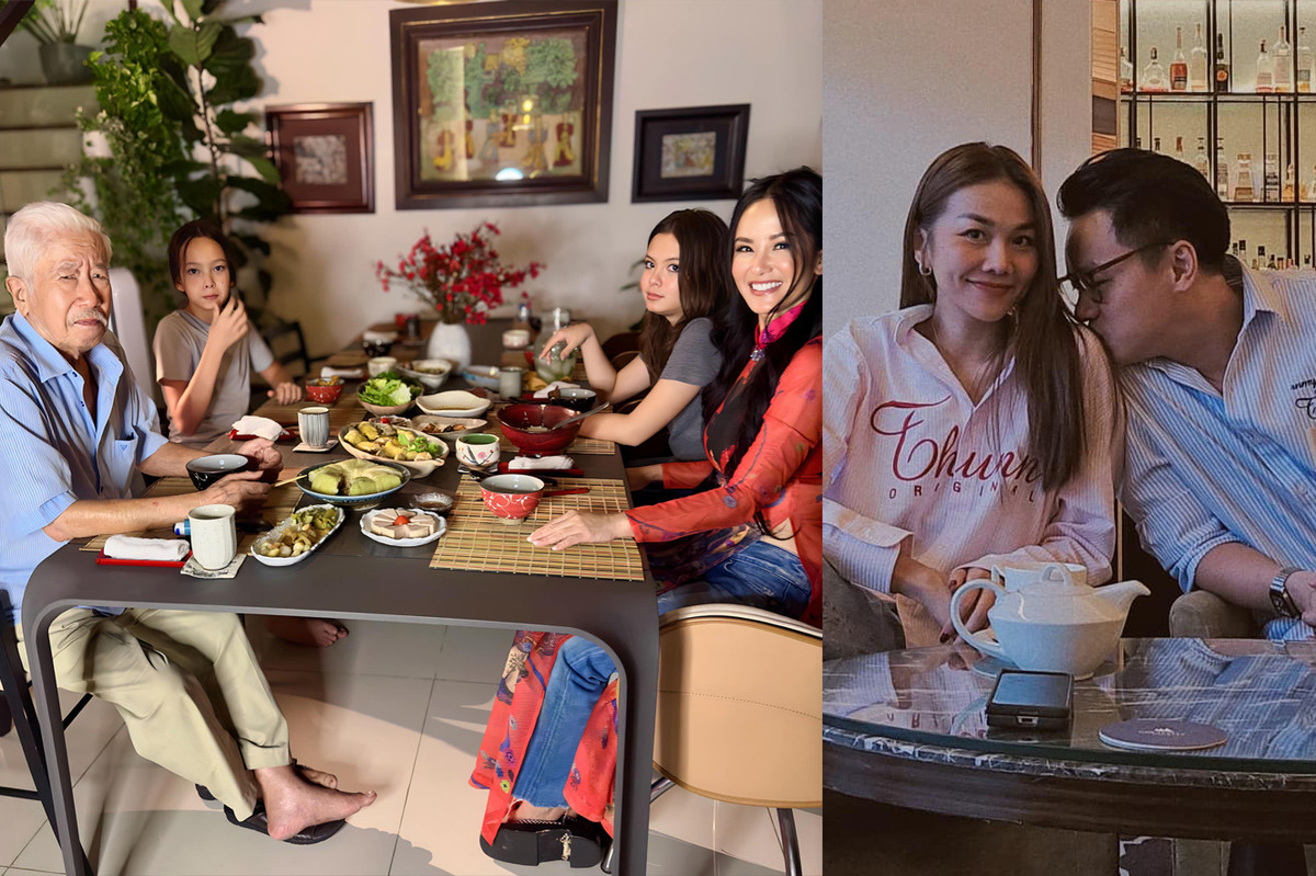 Hồng Nhung đón Tết bên bố cùng 2 con trong căn biệt thự mới tại TP.HCM. "Mừng ông ngoại bữa nay ngồi thử được tí bánh chưng cùng con cháu. Năm 2024 cả nhà kính xin đất trời cho ông sức khỏe", diva viết.