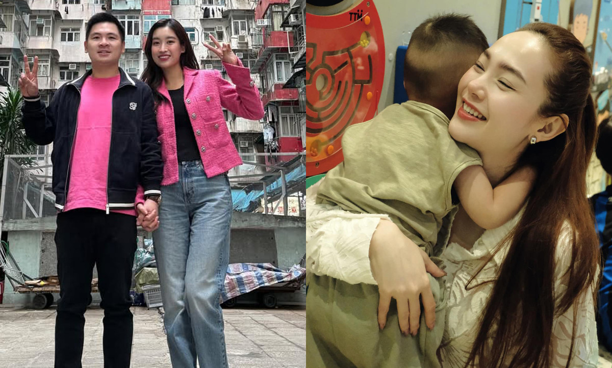 Hoa hậu Đỗ Mỹ Linh và ông xã doanh nhân Đỗ Vinh Quang mặc áo đồng điệu, nắm tay tạo dáng chụp hình tại khu chung cư nổi tiếng ở Hong Kong. Bức ảnh được ông xã Đỗ Mỹ Linh khoe với mọi người.