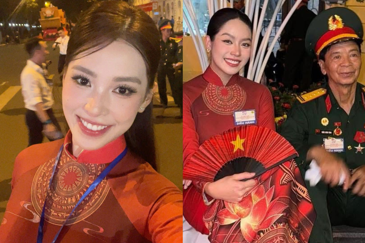 Hoa hậu Tiểu Vy rạng rỡ trong tà áo dài đỏ, có mặt từ 2h30 sáng tại điểm tập kết để cùng khối văn nghệ sĩ chuẩn bị tham gia lễ diễu binh lịch sử chào mừng 50 năm Ngày Giải phóng miền Nam, thống nhất đất nước.