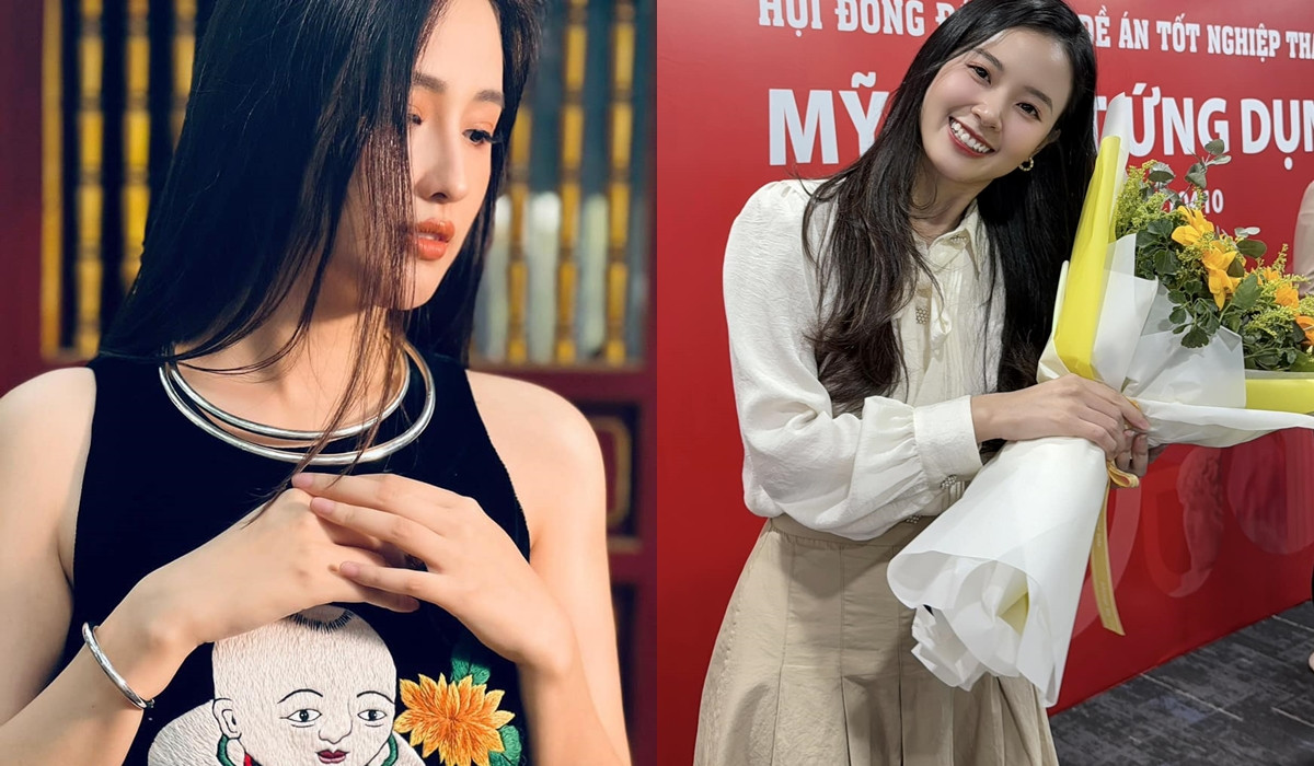 Người đẹp Midu trẻ trung, giản dị trong ngày đánh giá đề án tốt nghiệp thạc sĩ. Cô tiết lộ: "Ngày xưa thi đại học được á khoa, nay tốt nghiệp thạc sĩ cũng á khoa luôn".