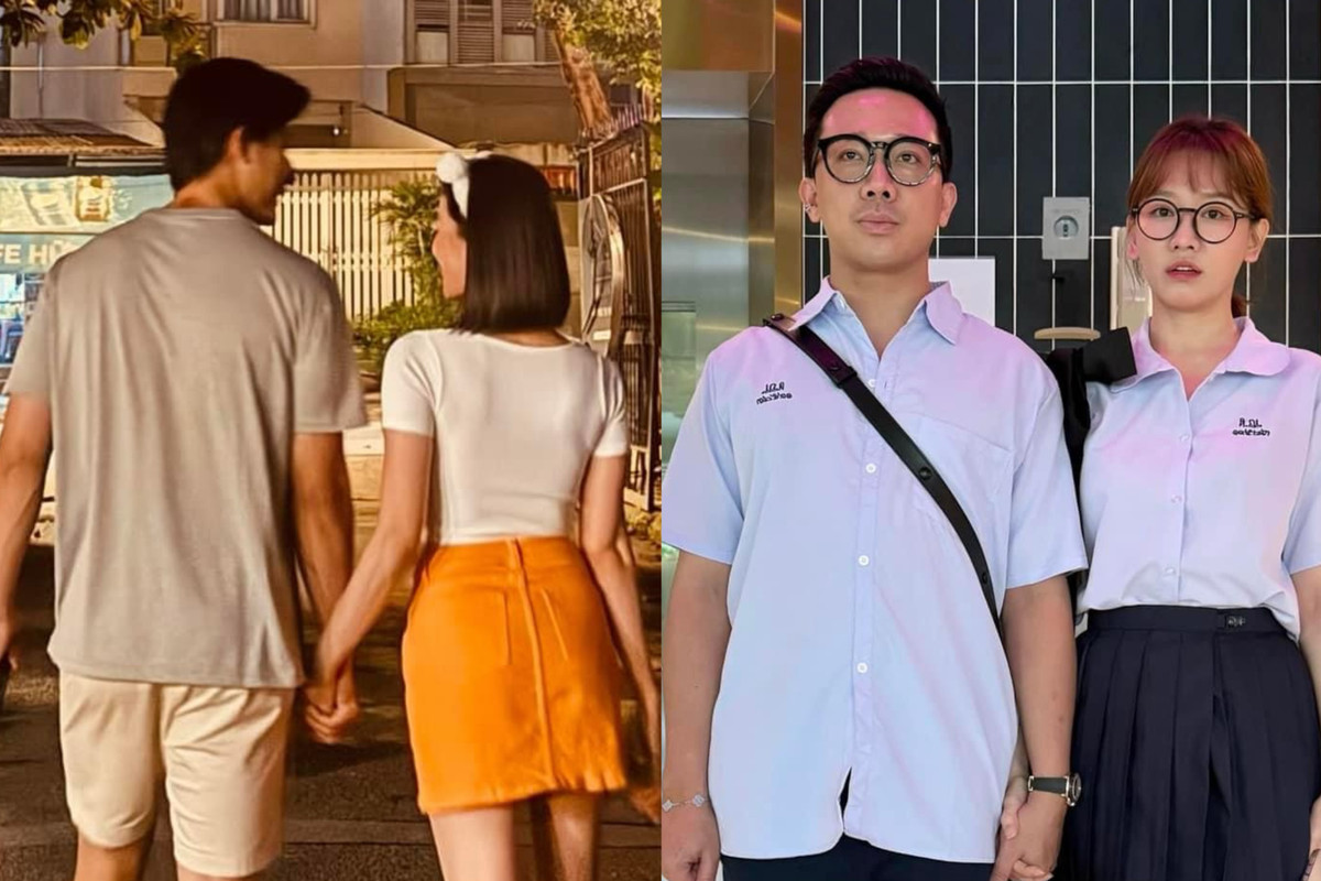 Trấn Thành và bà xã trẻ trung trong bộ đồng phục học sinh Thái Lan. Cả hai đang tận hưởng chuyến du lịch ở xứ sở chùa Vàng.