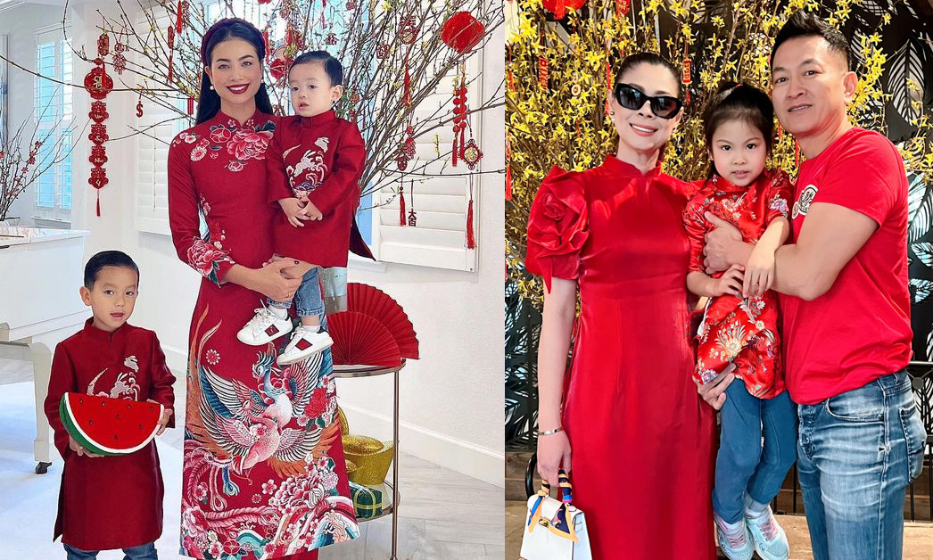 Phạm Hương cùng con trai diện áo dài đỏ ngày đầu năm. Dù sống bên Mỹ nhưng gia đình cô vẫn trang trí nhà cửa ngập tràn không khí Tết cổ truyền.