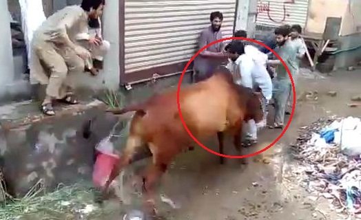 Con bò cái hoảng loạn, vùng lên tấn công người đàn ông khi người này chuẩn bị làm thịt nó, sự việc xảy ra tại Pakistan.