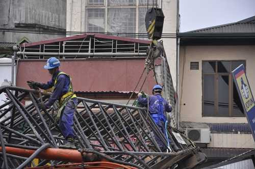 | Công nhân khẩn trương giải phóng hiện trường vụ sập cẩu (Ảnh: Minh Chiến) |
