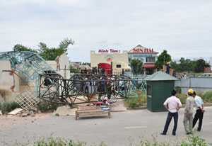 Hiện trường vụ việc, phần cẩn của xe cẩu bị gãy đôi đập xuống dưới khiến anh Thành bị chết tại chỗ