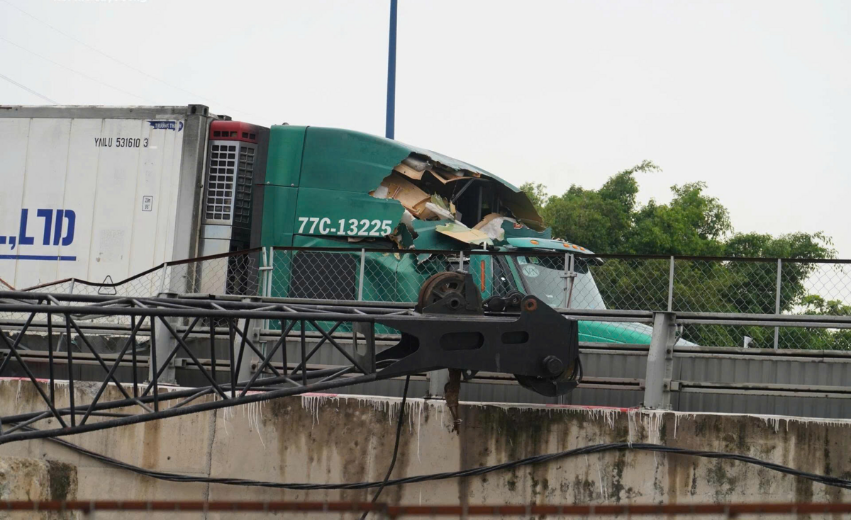 Xe container bị giàn cẩu đè trúng, hư hỏng nặng phần đầu xe. (Ảnh: L. Ý)