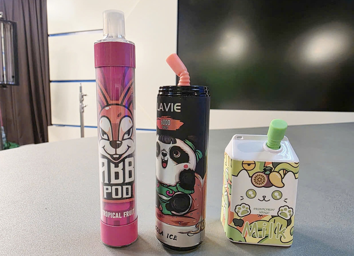Nhiều mẫu mã thuốc lá điện tử "núp bóng" đồ chơi, thực phẩm…hấp dẫn học sinh. (Ảnh: Như Loan)