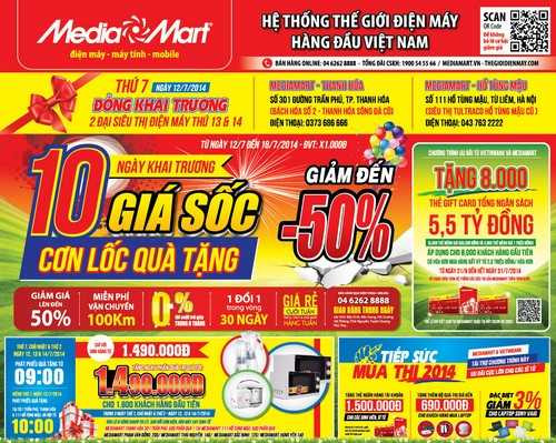 Nhân dịp khai trương 2 đại siêu thị mới, MediaMart mang đến chương trình “Giá sốc cơn lốc quà tặng”. Theo đó, MediaMart sẽ triển khai 1 chương trình Giảm giá trên quy mô lớn trong 10 ngày từ 12/7-21/7/2014, mua 1 tặng 1, chỉ với đơn hàng 1.490.000VNĐ, 1,200 khách hàng đầu tiên sẽ được nhận ngay các phần quà trị giá đến 1.490.000 đồng gồm Lò vi sóng Sharp 20 lít, Nồi cơm điện chống dính hay Máy xay sinh tố ...