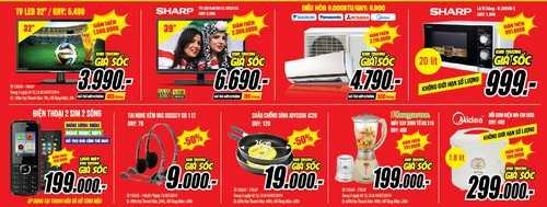 Tham gia chương trình, khách hàng còn cơ cơ hội mua sắm nhiều sản phẩm được bán với giá sốc theo từng khung giờ khách nhau. Cụ thể như: TV LED 32’’ giảm trực tiếp 1,5 triệu chỉ còn 3.990.000 đồng; TV LED Full HD 39’’ Sharp 39LE155 giảm 2,3 triệu còn 6.690.000 đồng; điều hòa 1 chiều 9000BTU thương hiệu Daikin, Panasonic, Midea giảm 2.1 triệu giá còn 4.790.000 đồng; máy xay sinh tố Kangaroo giá 199.000 đồng, chảo chống dính Joycook giá 19.000 đồng, lò vi sóng 20l Sharp R-205VN-S giá 990.000 đồng, Máy tính bảng giá chỉ còn 990.000 đồng, Điện thoại di động giá 199.000 đồng …