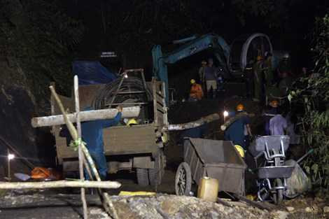 | Hiện công tác cứu hộ hai nạn nhân bị mắc kẹt trong hầm vẫn đang được lực lượng chức năng triển khai tích cực, bất kể trong đêm tối. |