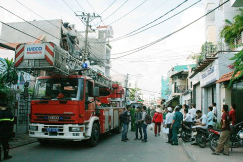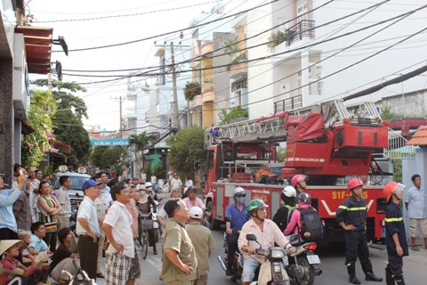 | Xe thang và hàng chục chiến sĩ được điều động đến hiện trường |