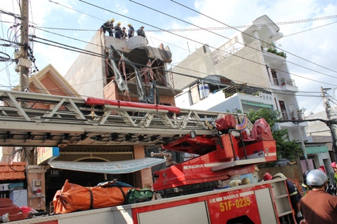 Một xe cứu hộ cùng hơn 20 chiến sĩ thuộc lực lượng Cảnh sát PCCC quận Gò Vấp cũng nhanh chóng được điều động đến hiện trường để tiến hành tháo dỡ mái vòm bê tông còn dính trên tầng 3 của căn nhà.