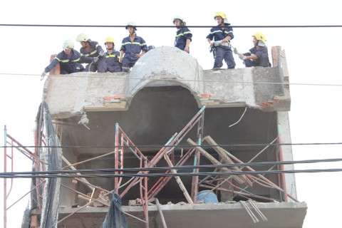 Đến 18 giờ 30, ngày 11/7 lực lượng cứu hộ vẫn đang nỗ lực tiến hành tháo dỡ mảng bê tông trên mái vòm tầng 3 của công trình xây dựng nhà ở, số 186 đường Nguyễn Văn Công (phường 3, quận Gò Vấp, TP.HCM).