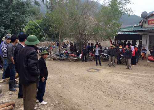 | Thân nhân và người dân đứng ngoài phạm vi phong tỏa mỏ đá để ngóng tin. Phía xa xa là mỏ đá, nơi nhóm công nhân gặp nạn. Ảnh: Lê Hoàng/VNE. |