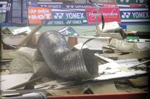 Một phần lớn trần Nhà thi đấu Phan Đình Phùng (TP.HCM) đã bị rơi xuống ngay khi các VĐV đang thi đấu ở Giải cầu lông quốc tế Việt Nam mở rộng 2014 vào tối 2/9.