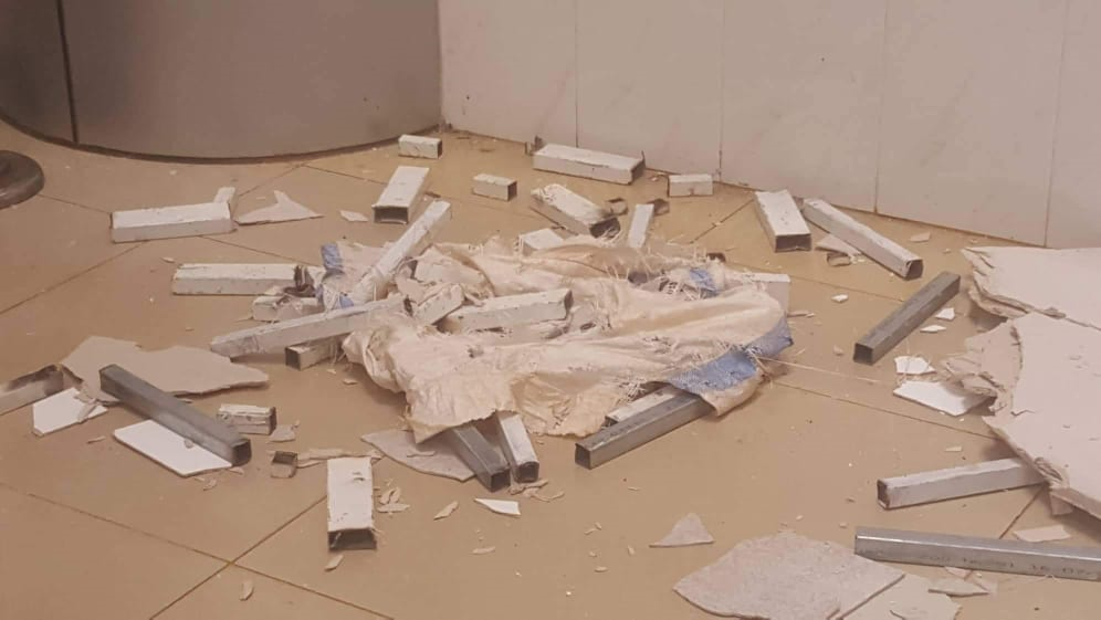 Nhiều thanh sắt và thạch cao rơi từ trên cao xuống sảnh.