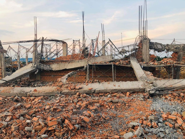 Cụ thể, bức tường bị đổ có chiều cao từ 10m đến hơn 15m, xung quanh có giàn giáo được bắc lên để công nhân đứng xây. Đáng nói, bức tường có chiều cao hơn 10m nhưng chưa được lắp khung mái hay đổ giằng bằng bê tông cốt thép để giữ cho tường vững.