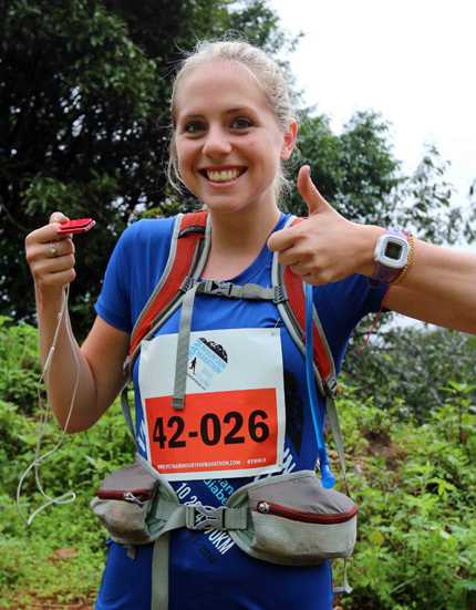Trần Thị Hoài Thương - cô gái duy nhất trong đoàn tỏ ra vô cùng phấn khích và liên tục chụp ảnh lưu niệm với đồng đội. Thương đã chạy được 2 năm nay và đã từng chạy đường trường lên đến 70km. Marathon vượt núi Việt Nam 2014 sẽ đem đến cho Thương kinh nghiệm chạy 42km trên đường núi lần đầu tiên. Cô bạn xác định mục đích của chuyến đi này là ngắm cảnh và cố gắng hoàn thành cự ly chứ không kỳ vọng đạt thành tích.