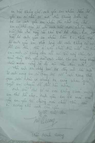 Nhìn tờ giấy có câu mở đầu “Dear Lãnh”, anh Linh nghi ngờ là một bức thư tình nên cầm lên đọc. Sau khi đọc xong nội dung tờ giấy, anh Linh càng “phát hỏa” khi tờ giấy là một bức thư tình mặn nồng của một người ký tên Trần Minh Quang (không rõ địa chỉ) gửi cho chị Lãnh.