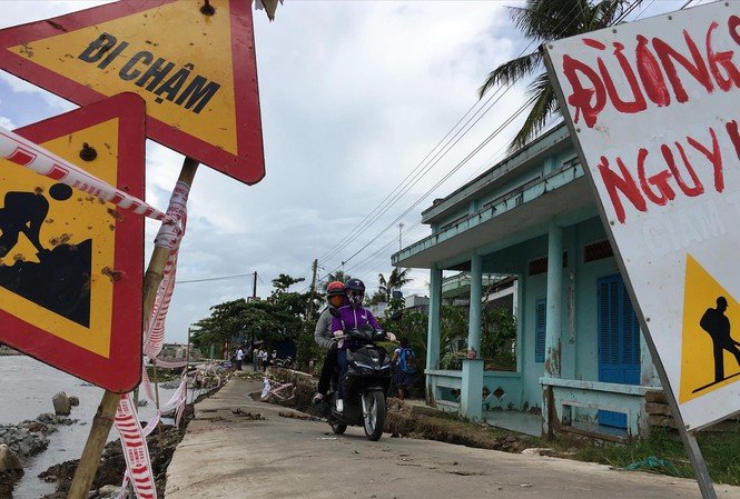 “Cách đây khoảng 10 năm, nhà tôi còn 2 lớp nhà nữa mới tới con đường bê tông 2,5 mét. Bây giờ con đường bê tông đã nằm lại dưới cửa biển rồi, nền nhà tôi cũng không còn miếng nào. Bám biển kiếm sống nhưng sóng gió làm cho mình lo lắng hằng đêm”- Mai Văn Tó, ở ấp Cồn Mũi, xã Đất Mũi (Ngọc Hiển, Cà Mau) nói.