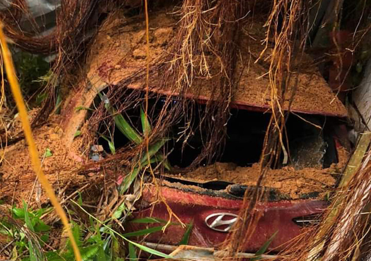 Một chiếc ô tô con tại Trạm Cảnh sát Giao thông Madaguôi bị vùi lấp. (Ảnh: Báo Lâm Đồng)