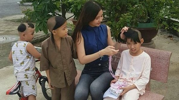 Một trong những hoạt động từ thiện mà Ngân Anh thực hiện là tới thăm những trẻ em mồ côi tại một ngôi chùa ở TP.HCM. Hoa hậu Đại dương ăn mặc giản dị và vui vẻ trò chuyện với các em có hoàn cảnh thiệt thòi.