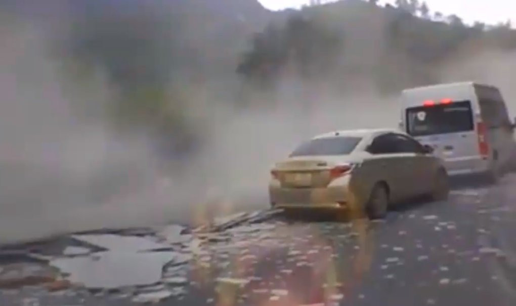 Sau cú tông mạnh, đá trên xe văng xuống đường, va vào nhiều phương tiện đang giao thông ngược chiều khiến 1 người bị thương và nhiều phương tiện hư hỏng.