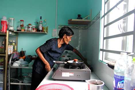Mẹ Oanh lau dọn góc bếp của nhà mới thật tươm tất mỗi ngày, mẹ nói "nhà thì mới nhưng cuộc sống bấp bênh lắm, làm ngày nào ăn ngày đó".