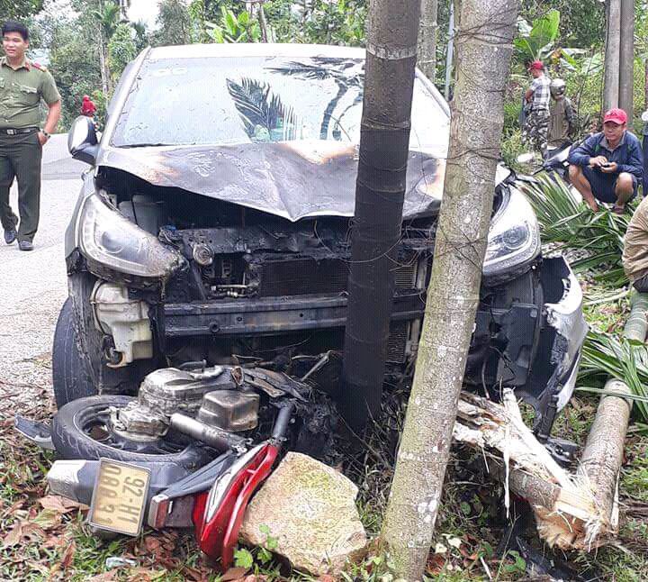 Sau cú tông trực diện, 2 người đi xe máy bị thương nặng được người dân đưa đi cấp cứu tại Bệnh viện Đa khoa tỉnh Quảng Nam. Riêng 2 chiếc xe bốc cháy, trong đó xe máy bị cháy trơ khung, xe ôtô bị cháy phần đầu.