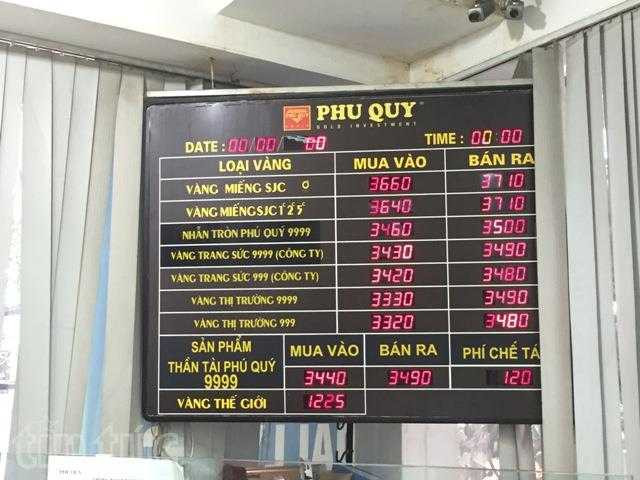 Tuy giao dịch tăng nhưng giá vàng buổi chiều tiếp tục giảm vài trăm nghìn đồng/lượng so với giá buổi sáng. Lúc 6 giờ chiều, doanh nghiệp này thông báo đã hết dòng nhẫn nửa chỉ, 1 chỉ và 2 chỉ.