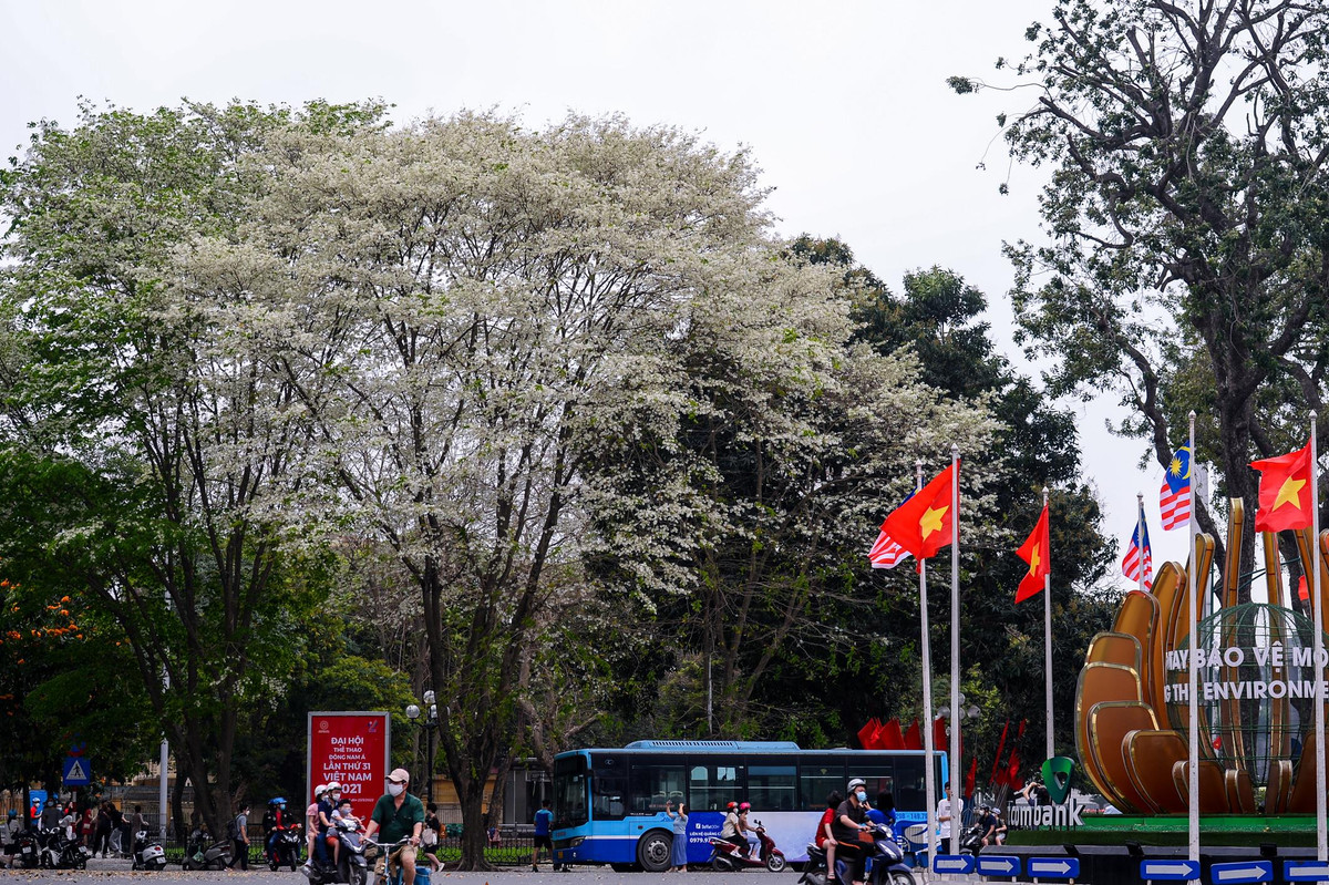 Những cây hoa sưa đang độ nở rộ trên đường Thanh Niên trắng như bông.